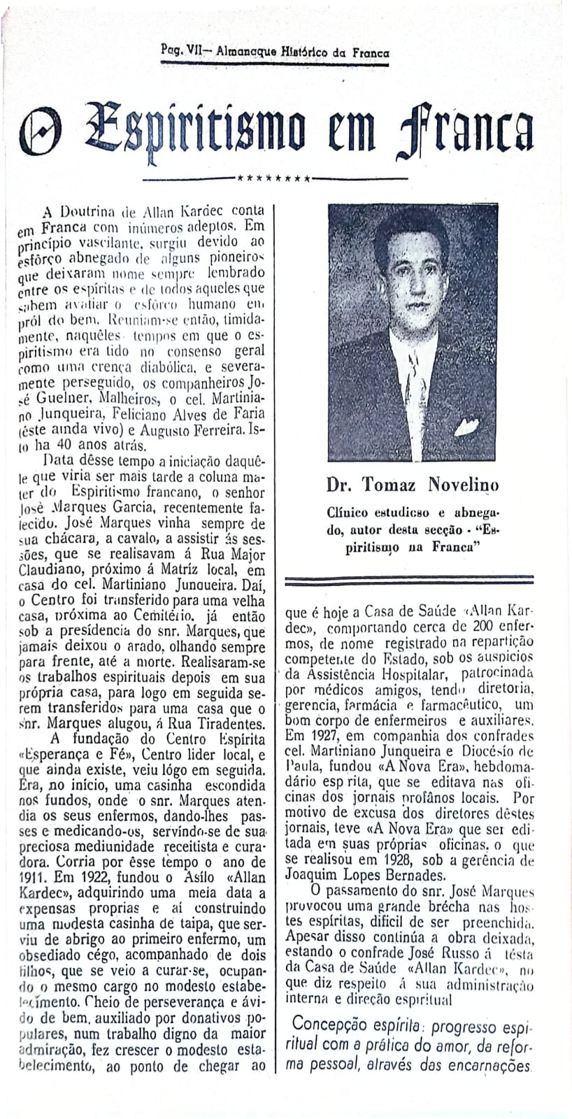 A Doutrina de Allan Kardec conta em Franca com inúmeros adeptos. Em princípio vacilante, surgiu devido ao esforço abnegado de alguns pioneiros que deixaram nome sempre lembrado entre os espíritas e de todos aqueles que sabem avaliar o esforço humano em prol do bem. Reuniam-se então, timidamente, naquêles tempos em que o espiritismo era tido no consenso geral como uma crença diabólica, e severamente perseguido, os companheiros José Guelner Malheiros, cel. Martiniano Junqueira, Feliciano Alves de Faria (êste anda vivo) e Augusto Ferreira. Isso ha 40 anos atrás.